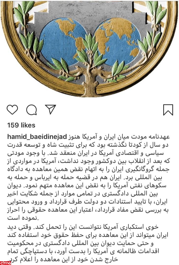 بعیدی نژاد افزود: خوی استکباری آمریکا نتوانست این را تحمل کند. وقتی دید ایران میتواند از این معاهده برای حفظ حقوق خود استفاده کند و حتی حمایت دیوان بین المللی دادگستری در محکومیت اقدامات ظالمانه ی آمریکا را بدست آورد، با دستپاچگی تمام خارج شدن خود از این معاهده را اعلام کرد. البته این اعلام خروج آمریکا تاثیری بر روند رسیدگی دیوان در شکایت اخیر ایران ندارد.