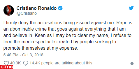 کریستیانو رونالدو در صفحه رسمی خود نوشت: «من به شدت اتهاماتی که در مورد تجاوز به من زده شده است را رد می کنم. تجاوز جنسی یک جنایت بی رحمانه بوده و با من و اعتقاداتم مغایرت دارد.