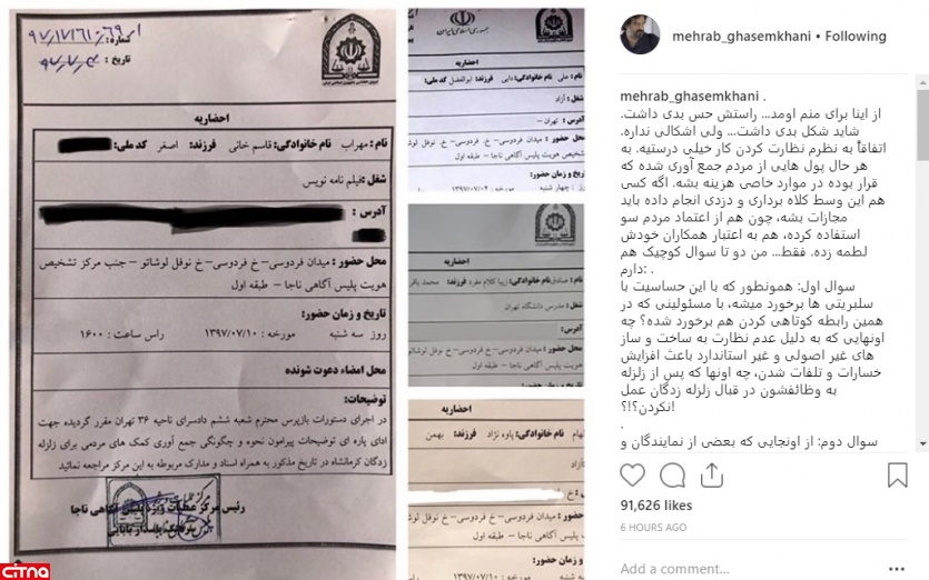 به گزارش سرویس وبگردی سیتنا، مهراب قاسم خانی با انتشار تصویری از احضاریهای که از دادگاه برایش آمده بود، در اینستاگرام نوشت: «از اینا برای منم اومد... راستش حس بدی داشت. شاید شکل بدی داشت... ولی اشکالی نداره. اتفاقاً به نظرم نظارت کردن کار خیلی درستیه. به هر حال پول هایی از مردم جمع آوری شده که قرار بوده در موارد خاصی هزینه بشه. اگه کسی هم این وسط کلاه برداری و دزدی انجام داده باید مجازات بشه، چون هم از اعتماد مردم سو استفاده کرده، هم به اعتبار همکاران خودش لطمه زده. فقط... من دو تا سوال کوچیک هم دارم.