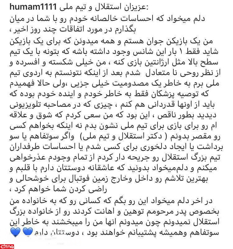 حال او با انتشار پستی در اینستاگرام خود از هوداران و مسئولین استقلال عذرخواهی کرد.