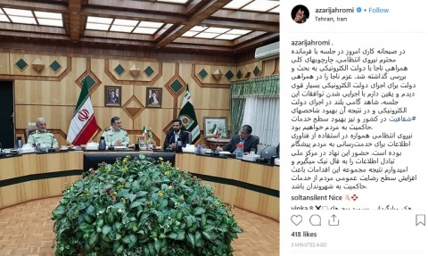 در صبحانه کاری امروز در جلسه با فرمانده محترم نیروی انتظامی، چارچوبهای کلی همراهی ناجا با دولت الکترونیکی به بحث و بررسی گذاشته شد. عزم ناجا را در همراهی دولت برای اجرای دولت الکترونیکی بسیار قوی دیدم و یقین دارم با اجرایی شدن توافقات این جلسه، شاهد گامی بلند در اجرای دولت الکترونیکی و در نتیجه آن بهبود شاخصهای شفافیت در کشور و نیز بهبود سطح خدمات حاکمیت به مردم خواهیم بود.