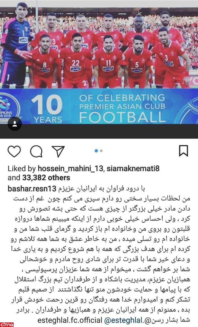 «با درود فراوان به ایرانیان عزیزم. من لحظات بسیار سختی رو دارم سپری میکنم، چون غم از دست دادن مادر خیلی بزرگتر از چیزی هست که حتی بشه تصورش رو کرد، ولی احساس خیلی خوبی دارم از اینکه میبینم شماها دروازه قلبتون رو بروی من وخانواده ام باز کردید و گرمای قلب شما من و خانواده ام رو تسلی میده، من به خاطر عشق به شما همه تلاشم رو کرده ام برای هدف بزرگی که همه با هم شروع کردیم و به یاری خدا و دعای خیر شما با قدرتتر برای شادی روح مادرم و خوشحالی شما بر خواهم گشت، میخوام از همه شما عزیزان پرسپولیسی، همبازیان عزیزم٫ مدیریت باشگاه و از طرفداران تیم بزرگ استقلال که با پیامها و حمایت خودشون منو تنها نگذاشتند از صمیم قلبم تشکر کنم و امیدوارم خدا همه رفتگان رو قرین رحمت خودش قرار بده، ممنونم از همه ایرانیان عزیزم و همبازیها و طرفداران. برادر شما بشار»