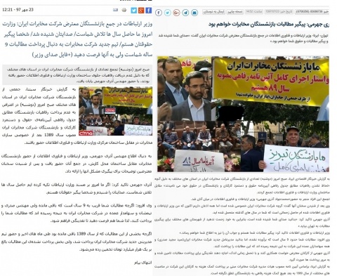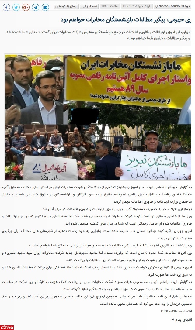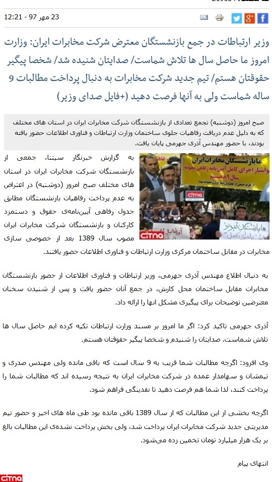 سیتنا در ساعت 12:21 روز 23 مهر 97 خبر حضور وزیر ارتباطات در جمع بازنشستگان معترض شرکت مخابرات ایران را به همراه تصاویر و فایل صوتی مربوطه منتشر کرد (لینک). حدود 2 ساعت بعد یعنی ساعت 14:52 این خبر با تغییرات جزئی و بدون ذکر منبع در ایرنا منتشر شده است (لینک). عجیب تر آنکه عکس اصلی سیتنا از این تجمع که حاصل ترکیب چهار عکس کنار هم بوده است نیز توسط ایرنا منتشر شده و لوگوی سیتنا در وسط این عکس نیز به صورت غیرحرفه ای سیاه شده است.