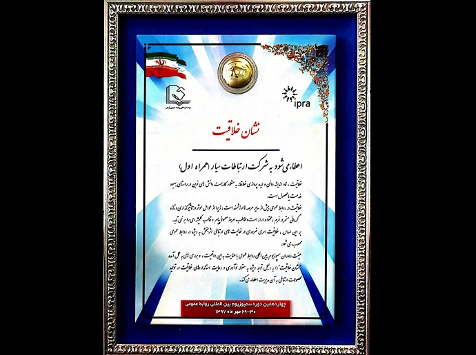 به گزارش سیتنا به نقل از اداره کل ارتباطات شرکت ارتباطات سیار ایران، در چهاردهمین دوره سمپوزیوم بین المللی روابط عمومی و پانزدهمین جشنواره برترین های روابط عمومی ایران که روز دوشنبه ۳۰ مهر ماه در مرکز همایش های کتابخانه ملی برگزار شد، از روابط عمومی همراه اول با اعطای نشان «خلاقیت» تقدیر به عمل آمد.