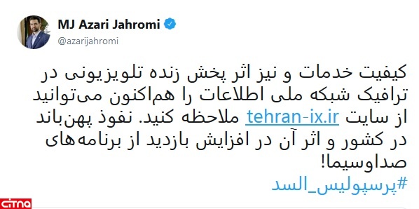 به گزارش سیتنا، مهندس آذری جهرمی ساعاتی پیش و همزمان با پخش دیدار تیم های فوتبال پرسپولیس و السد قطر، توئیت کرد: کیفیت خدمات و نیز اثر پخش زنده تلویزیونی در ترافیک شبکه ملی اطلاعات را هماکنون میتوانید از سایت http://tehran-ix.ir ملاحظه کنید.