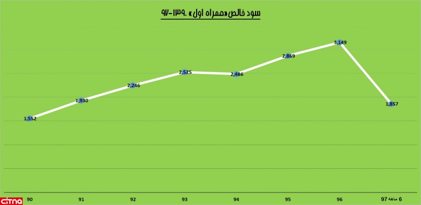 در نمودار ذیل، روند سود خالص «همراه» از سال 90 تا 6 ماهه 97 را ملاحظه می کنید.