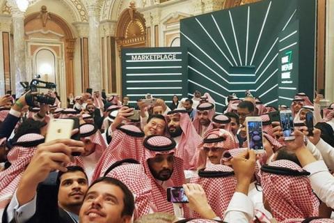 محمدبن سلمان در نشست داوس صحرا در حال سلفی گرفتن با میهمانان.