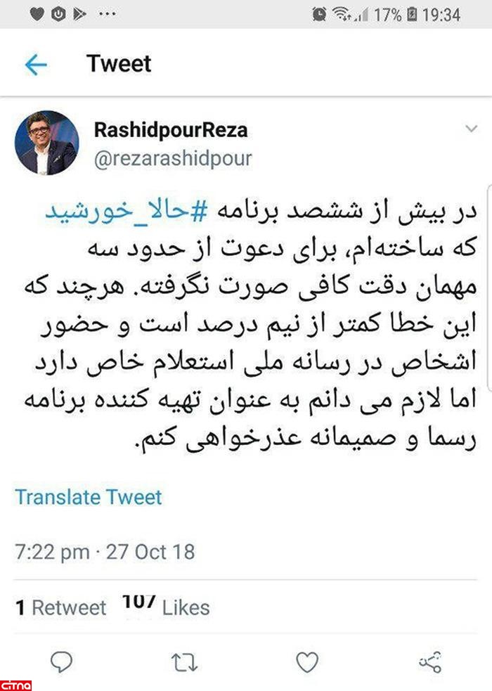 به همین دلیل، رضا رشیدپور در یک توئیت برای این که در دعوت از این مهمان دقت کافی صورت نگرفته است، عذرخواهی کرد. او توئیت کرده است: