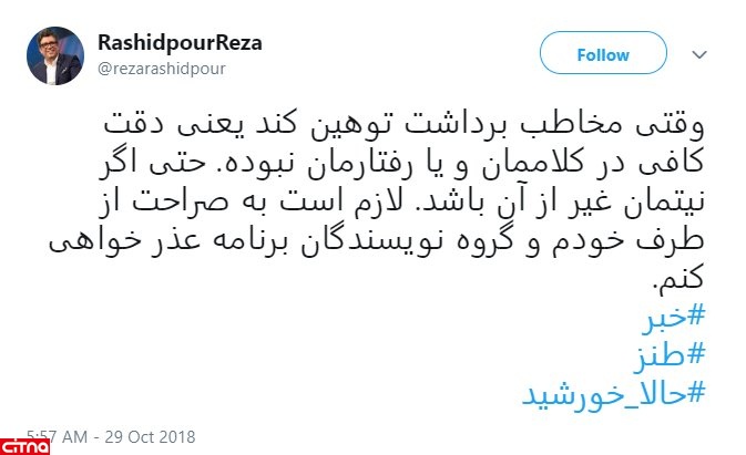 به گزارش سرویس وبگردی سیتنا، رضا رشیدپور در واکنش به انتقادها از یکی از بخشهای برنامه امروز «حالا خورشید» در توییتی نوشت: «وقتی مخاطب برداشت توهین کند یعنی دقت کافی در کلاممان و یا رفتارمان نبوده است. حتی اگر نیتمان غیر از آن باشد. لازم است به صراحت از طرف خودم و گروه نویسندگان برنامه عذر خواهی کنم.»