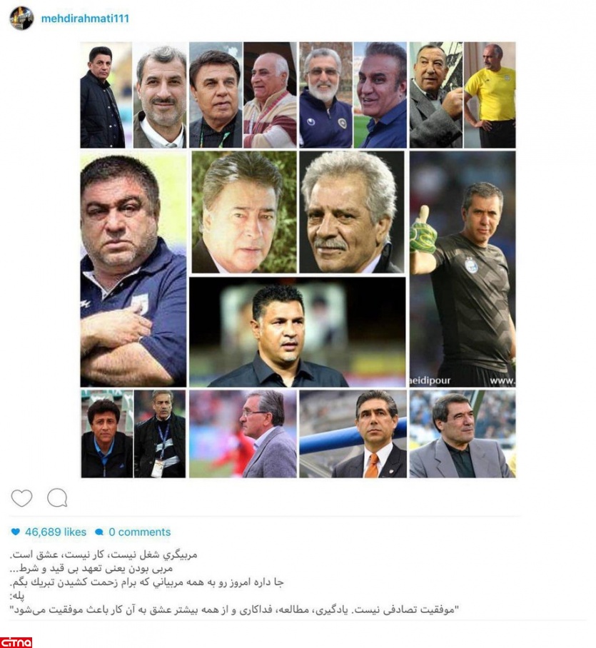 به گزارش سرویس وبگردی سیتنا، مهدی رحمتی با گذاشتن پستی در صفحه اینستاگران خودش روز مربی را تبریک گفت. نکته جالب درباره عکسی که مشاهده می کنید این است که کارلوس کی روش سرمربی تیم ملی در بین مربیانی که رحمتی از آنها یاد کرده حضور ندارد.