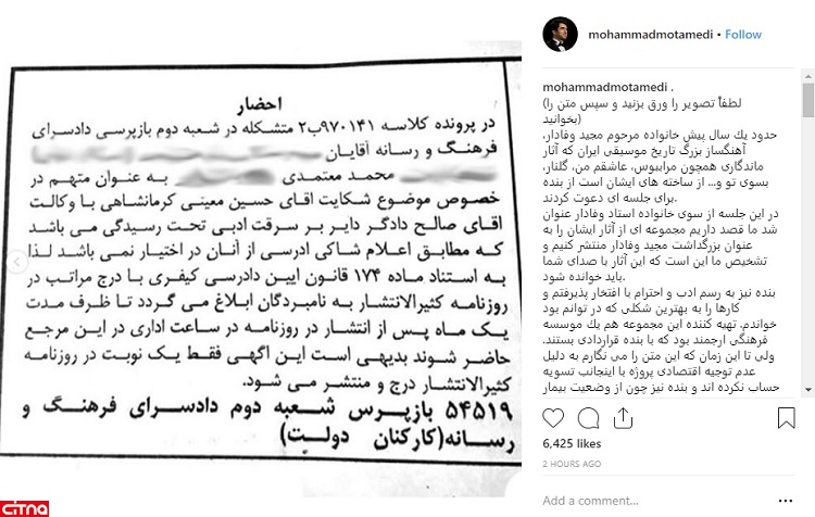 محمد معتمدی با انتشار تصویری از برگه احضاریه خود در صفحه اینستاگرامش نوشته است: "حدود یک سال پیش خانواده مرحوم مجید وفادار، آهنگساز بزرگ تاریخ موسیقى ایران که آثار ماندگارى همچون مراببوس، عاشقم من، گلنار، بسوى تو و... از ساخته هاى ایشان است از بنده براى جلسه اى دعوت کردند.