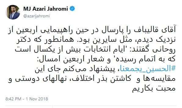 آقای قالیباف را پارسال در حین راهپیمایی اربعین از نزدیک دیدم، مثل سایرین بود. همانطور که دکتر روحانی گفتند: 'ایام انتخابات بیش از یکسال است که به اتمام رسیده' و شعار اربعین امسال: الحسین یجمعنا، پیشنهاد میکنم جای این مقایسهها و کاشتن بذر اختلاف، نهالهای دوستی و محبت بکاریم.