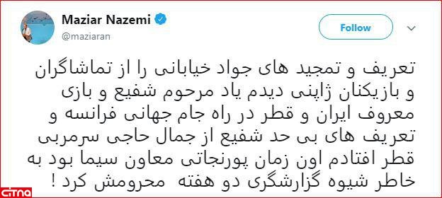 یکی از این واکنش ها را مازیار ناظمی مدیر روابط عمومی وزارت ورزش داشت که با خاطره نگاری از یکی از گزارش های پرحرف و حدیث مرحوم بهرام شفیع آغاز شد. ناظمی در توئیت خود نوشت:« تعریف و تمجید های جواد خیابانی را از تماشاگران و بازیکنان ژاپنی دیدم یاد مرحوم شفیع و بازی معروف ایران و قطر در راه جام جهانی فرانسه و تعریف های بی حد شفیع از جمال حاجی سرمربی قطر افتادم اون زمان پورنجاتی معاون سیما بود به خاطر شیوه گزارشگری دو هفته محرومش کرد!».
