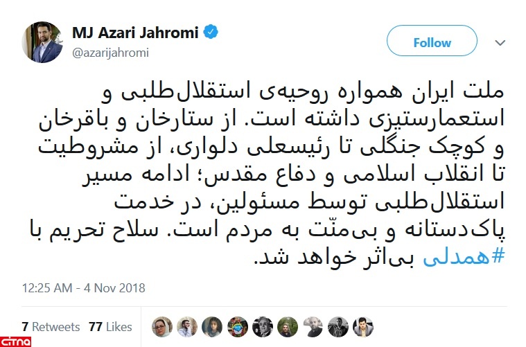 ملت ایران همواره روحیهی استقلالطلبی و استعمارستیزی داشته است. از ستارخان و باقرخان و کوچک جنگلی تا رئیسعلی دلواری، از مشروطیت تا انقلاب اسلامی و دفاع مقدس؛ ادامه مسیر استقلالطلبی توسط مسئولین، در خدمت پاکدستانه و بیمنّت به مردم است. سلاح تحریم با همدلی بیاثر خواهد شد.