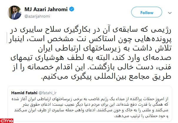 به گزارش سیتنا، به دنبال دفع حمله به زیرساخت های ارتباطی کشور، آذری جهرمی توئیت کرد: