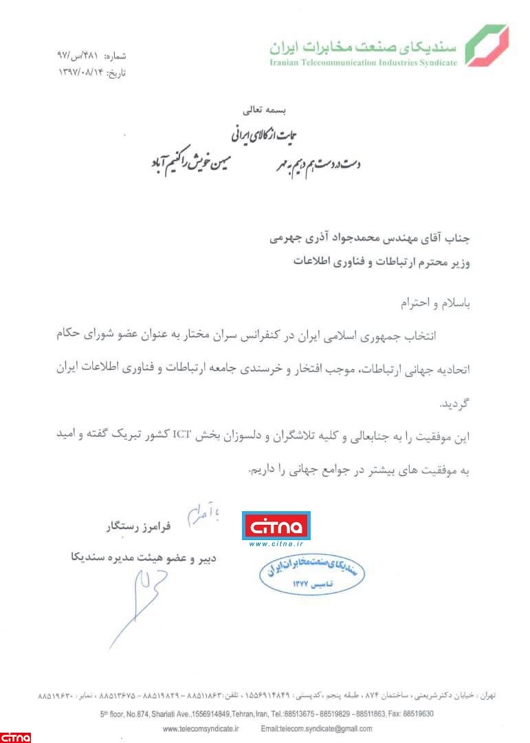 سندیکای صنعت مخابرات ایران طی نامه ای به وزیر ارتباطات و فناوری اطلاعات، موفقیت جمهوری اسلامی ایران برای حضور در شورای حکام اتحادیه جهانی ارتباطات را به وی و جامعه فاوای کشور تبریک گفت.