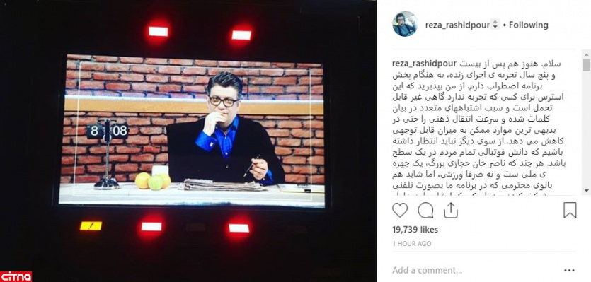 به گزارش سرویس وبگردی سیتنا، رضا رشیدپور با انتشار تصویری از خود در برنامه «حالا خورشید»، به پیامهای تحقیر آمیز کاربران درباره شرکت کننده مسابقه تلفنی این برنامه واکنش نشان داد و نوشت: