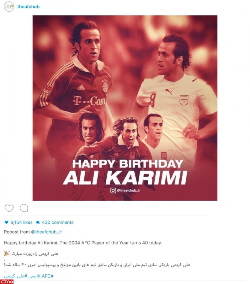 صفحه اینستاگرام کنفدراسیون فوتبال آسیا تولد علی کریمی را تبریک گفت.