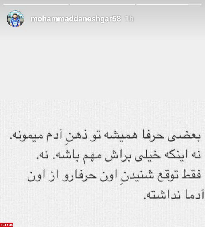 در نهایت، سومین استوری اش نیز جالب و البته معنادار بود. دانشگر نوشت: «بعضی حرفا همیشه تو ذهن آدم میمونه. نه اینکه خیلی براش مهم باشه. نه. فقط توقع شنیدن اون حرفارو از اون آدما نداشته.» و به نظر میرسد برای نوشتن این استوری و انتشار آن عکس ها، منظور مهم و «مخاطب خاصی» داشته است.