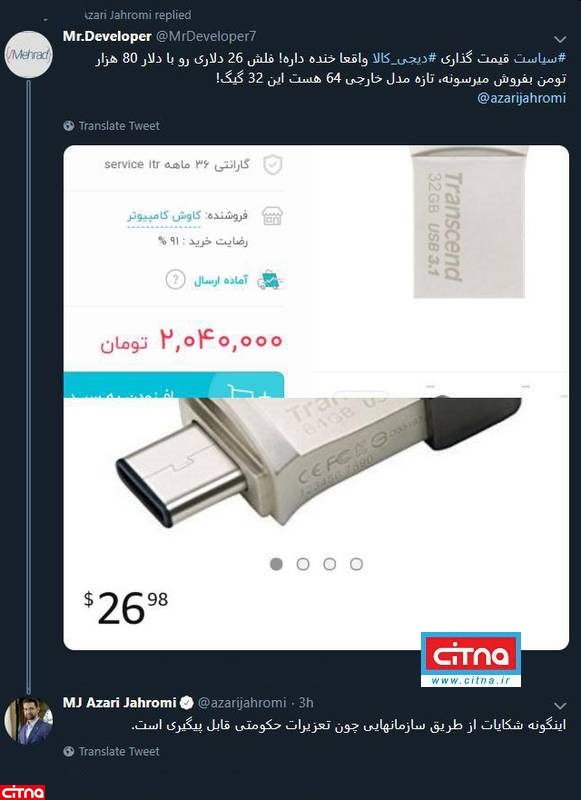 به گزارش سیتنا، وزیر ارتباطات و فناوری اطلاعات در پاسخ به توئیت یکی از کاربران پیرامون گرانفروشی دیجیکالا نوشت: اینگونه شکایات از طریق سازمانهایی همچون تعزیرات حکومتی قابل پیگیری است.