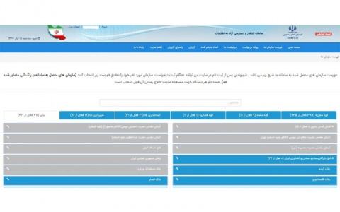 بر این اساس، نهادهای مختلف در این سایت به شش دسته: قوه مجریه، قوه مقننه، قوه قضاییه، استانداریها، شهرداریها و سایر تقسیم شده است. در زیرمجموعه قوه مجریه 635 نهاد تعریف شده که از بین آنها، تنها 389 نهاد به این سامانه متصل شدهاند. نهاد ریاست جمهوری، معاونت اجرایی رئیسجمهوری، وزارت اطلاعات و وزارت دفاع و پشتیبانی نیروهای مسلح ازجمله غایبان قوه مجریه در سامانه انتشار و دسترسی آزادانه به اطلاعات هستند. در عین حال، نهادهایی همچون وزارت دادگستری با یک زیرمجموعه، سازمان اداری و استخدامی کشور با دو زیرمجموعه، وزارت نیرو با 11 زیرمجموعه و وزارت کشور با پنج زیرمجموعه ازجمله بخشهای دولتی هستند که بهطور کامل به این سامانه متصل شدهاند و امکان دسترسی به اطلاعات آنان برای مردم فراهم است.
