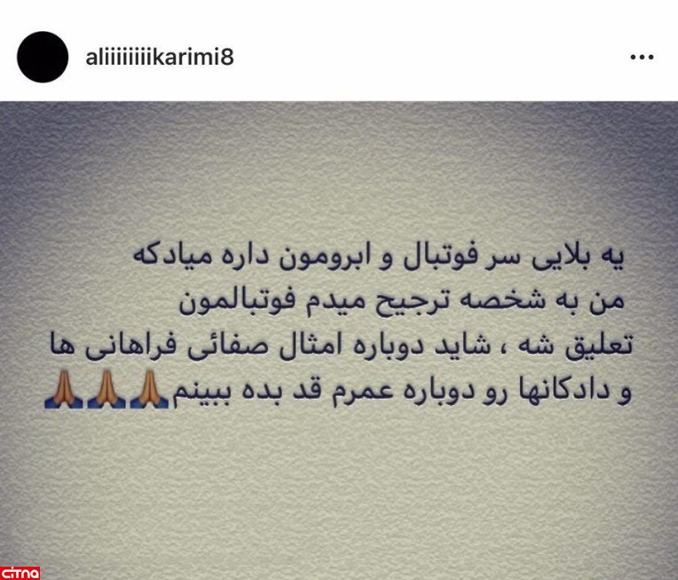 به گزارش سرویس وبگردی سیتنا، علی کریمی که مدتی است زبان آتشین فوتبال ایران است در آخرین واکنش مجازیاش در اینستاگرام، نوشت: