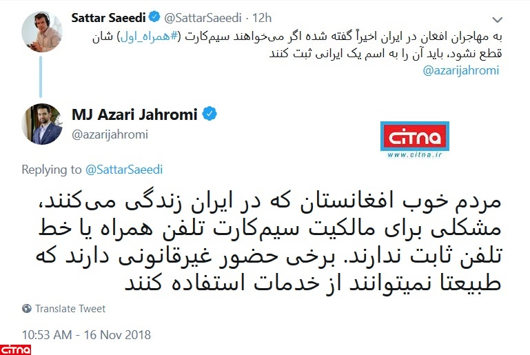 در پاسخ به این توئیت، مهندس آذری جهرمی پاسخ داد: "مردم خوب افغانستان که در ایران زندگی میکنند، مشکلی برای مالکیت سیمکارت تلفن همراه یا خط تلفن ثابت ندارند. برخی حضور غیرقانونی دارند که طبیعتا نمی توانند از خدمات استفاده کنند."