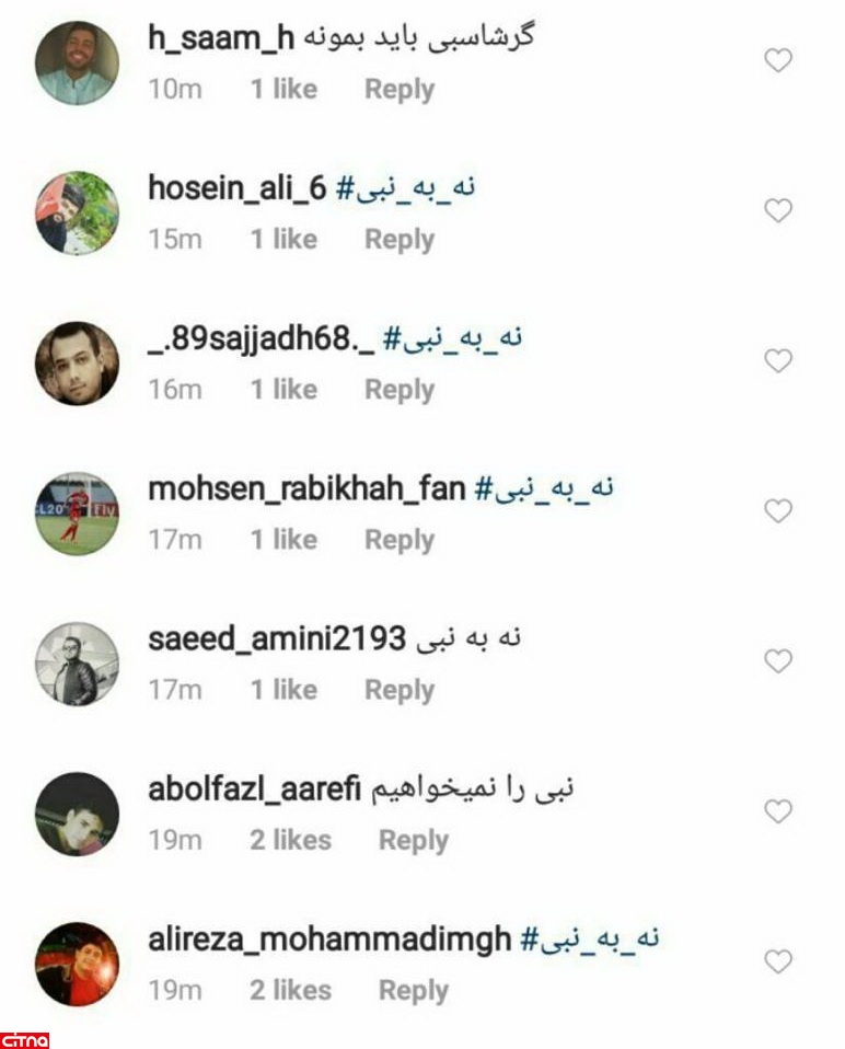 آنها برای دور کردن نبی از باشگاه پرسپولیس کمپین «#نه-به-نبی» را تشکیل دادند تا به صورت سازمان یافته، خواسته شان را مطرح کنند.