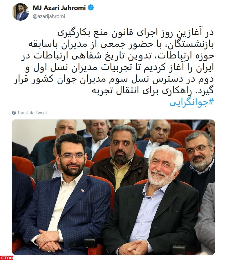 به گزارش خبرنگار سیتنا، روز گذشته مهندس آذری جهرمی با انتشار عکسی در توئیترش در کنار مدیران سابق وزارت ارتباطات و فناوری اطلاعات و مهندس غرضی وزیر اسبق این وزارتخانه، نوشته بود که تدوین تاریخ شفاهی ارتباطات در ایران را آغاز کردیم تا تجربیات مدیران نسل اول و دوم در دسترس نسل سوم مدیران جوان کشور قرار گیرد.