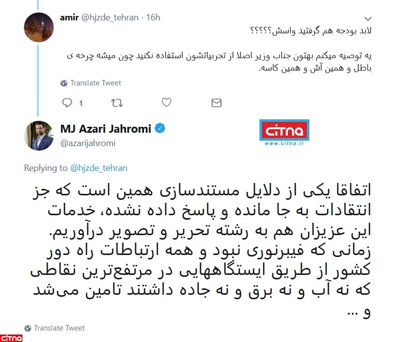 وزیر ارتباطات و فناوری اطلاعات هم در پاسخ به این کاربر توئیت کرد: اتفاقا یکی از دلایل مستندسازی همین است که جز انتقادات به جا مانده و پاسخ داده نشده، خدمات این عزیزان هم به رشته تحریر و تصویر درآوریم. زمانی که فیبرنوری نبود و همه ارتباطات راه دور کشور از طریق ایستگاههایی در مرتفعترین نقاطی که نه آب و نه برق و نه جاده داشتند تامین میشد و ...