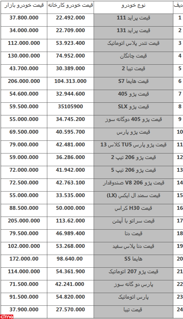 پژو206 تیپ 2 هم با قیمت 59 میلیون تومان، پژو207 اتوماتیک با افزایش یک میلیون تومانی با قیمت 114 میلیون تومان و پژو206 صندوقدار با قیمت 72 میلیون و 500 هزار تومان مورد معامله قرار میگیرد.