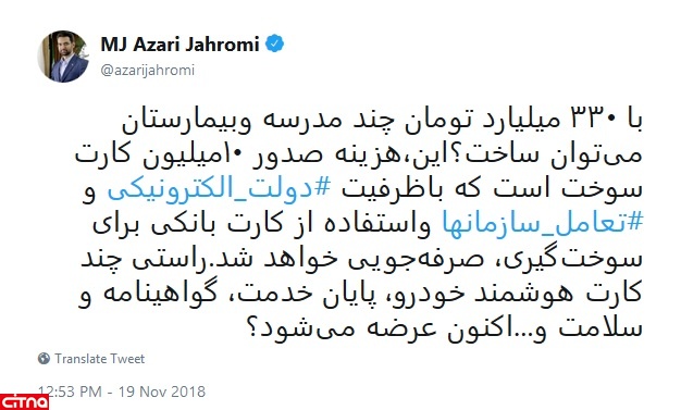 در پی اعلام وزیر ارتباطات و فناوری اطلاعات مبنی بر صرفهجویی 330 میلیارد تومانی در هزینهها با اتصال کارتهای سوخت به کارت بانکی با استفاده از ظرفیت دولت الکترونیک، آذری جهرمی نوشت: ا ۳۳۰ میلیارد تومان چند مدرسه و بیمارستان میتوان ساخت؟ این، هزینه صدور ۱۰ میلیون کارت سوخت است که با ظرفیت دولت الکترونیکی و تعامل سازمانها و استفاده از کارت بانکی برای سوختگیری، صرفهجویی خواهد شد.