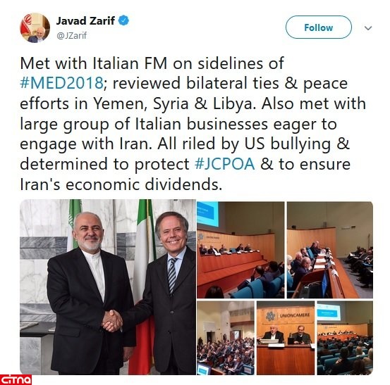 در حاشیه کنفرانس "گفتگوهای مدیترانه ای" با وزیر امور خارجه ایتالیا دیدار و روابط دوجانبه و تلاش ها برای صلح در یمن، سوریه و لیبی را مرور کردیم. همچنین با گروه بزرگی از فعالان اقتصادی ایتالیا که علاقمند به کار با ایران هستند، دیدار کردم. همه آنها از مزاحمت های آمریکا عصبانی اند ولی مصمم به حمایت از برجام و منافع اقتصادی ایران هستند.