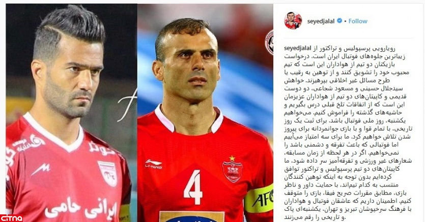 به گزارش سرویس وبگردی سیتنا، مسعود شجاعی و سیدجلال حسینی در اقدامی هماهنگ، متنی یکسان در صفحه اینستاگرام خود منتشر کردند تا دیدار این دو تیم که همواره با حساسیت همراه بوده به بهترین شکل و با کمترین حاشیه از روی سکوها دنبال شود. در این متن آمده: