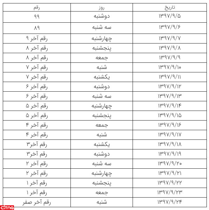 جدول زمانبندی مراجعه به سامانه خدمات دولت همراه براساس رقم سمت راست شماره تلفن همراه: