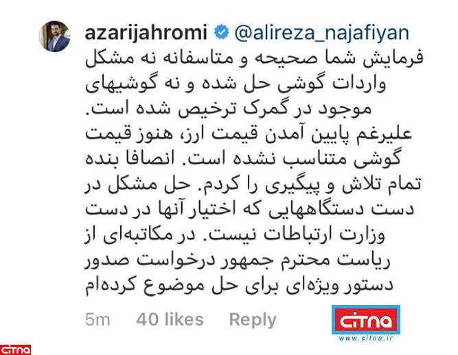 به گزارش سیتنا، مهندس آذری جهرمی در پاسخ به گلایهی یک کاربر اینستاگرام از گرانی گوشی های تلفن همراه نوشت: