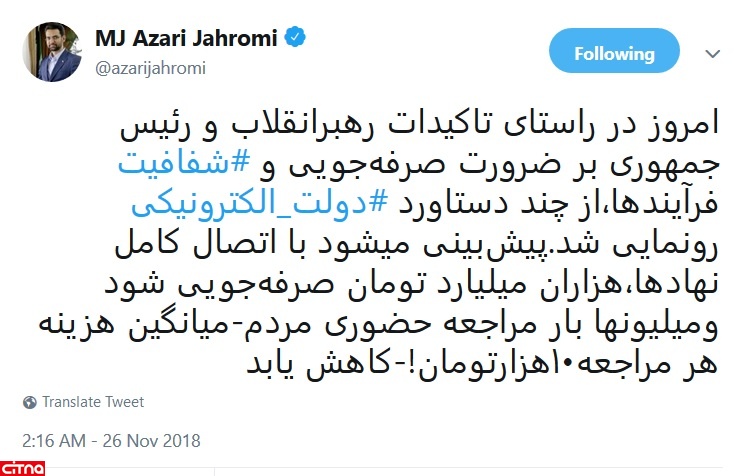 به گزارش سیتنا، مهندس آذری جهرمی توئیت کرد: