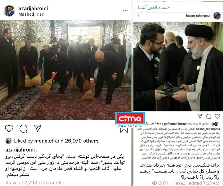 به گزارش سیتنا، به دنبال انتشار عکس مهندس آذری جهرمی در حال خادمی و جاروکشی در حرم امام رضا (ع)، حسن رحیمپور ازغدی که ید طولایی در انتقاد از چنین اتفاقاتی دارد، با انتشار متنی طعنهآمیز نوشت: «اشکالی ندارد که مسئولین بلندپایه، خادم افتخاری امام رضا شوند، خیلی هم خوب است. اما اینکه اغلب این دوستان یدونه از این گردگیرهای رنگی دستشون میگیرن و کنار استراتژیک ترین معبر ممکن میایستند که به طور کاملا اتفاقی خیلی خوب هم دیده میشوند و تنها کاری که لازم است انجام دهند این است که بگویند: «آقا حرکت کن». *چرا نمیروید توالتهای حرم را بشویید؟