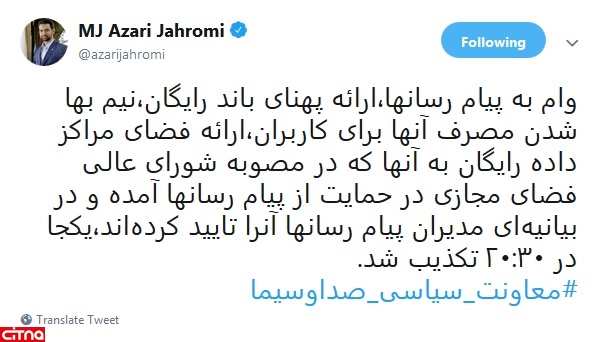 به گزارش سیتنا، مهندس آذری جهرمی توئیت کرد: