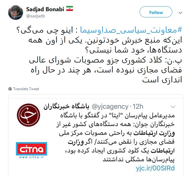 به گزارش سیتنا، سجاد بنابی. دستیار وزیر ارتباطات در امور جوانان با اشاره به گفت و گوی باشگاه خبرنگاران با مدیرعامل پیام رسان ایتا، توئیت کرد: