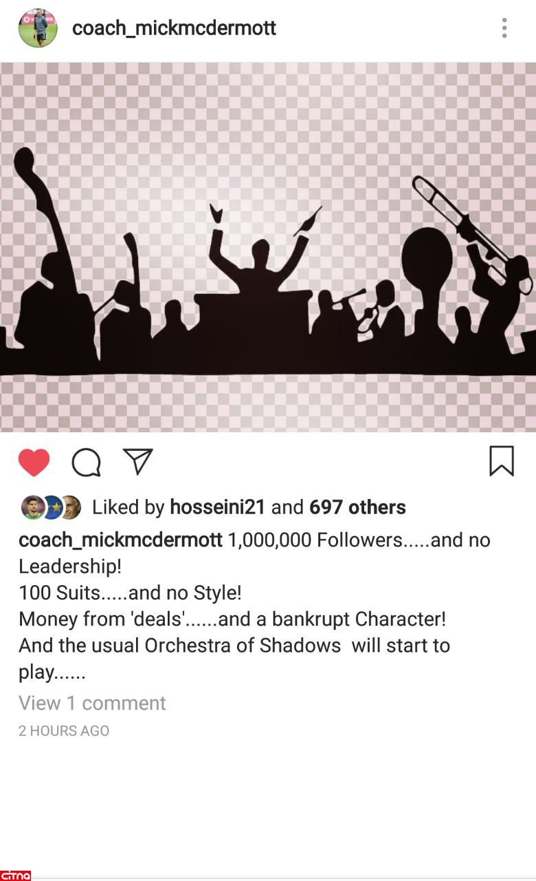 مک درموت با انتشار مطلبی در صفحه اینستاگرام خود به سرمربی تیم فوتبال پرسپولیس طعنه زد.