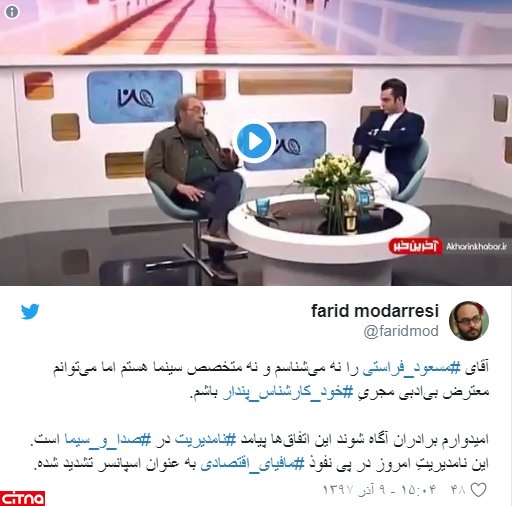 در واکنش به این اتفاق، فرید مدرسی، روزنامه نگار در توییتی نوشت: «آقای مسعود فراستی را نه میشناسم و نه متخصص سینما هستم اما میتوانم معترض بیادبی مجری خود کارشناس پندار باشم. امیدوارم برادران آگاه شوند این اتفاقها پیامد نامدیریت در صدا و سیما است. این نامدیریت امروز در پی نفوذ مافیای اقتصادی به عنوان اسپانسر تشدید شده.»