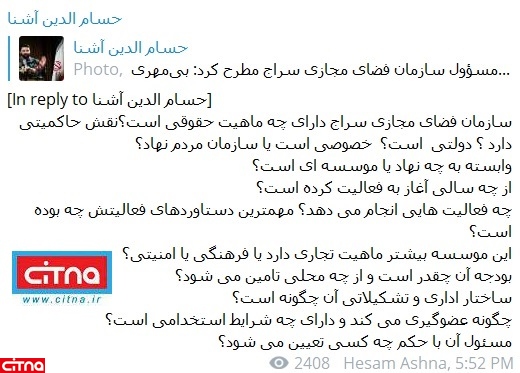 سلسله سوالات حسامالدین آشنا پیرامون ماهیت "سازمان فضای مجازی سراج"