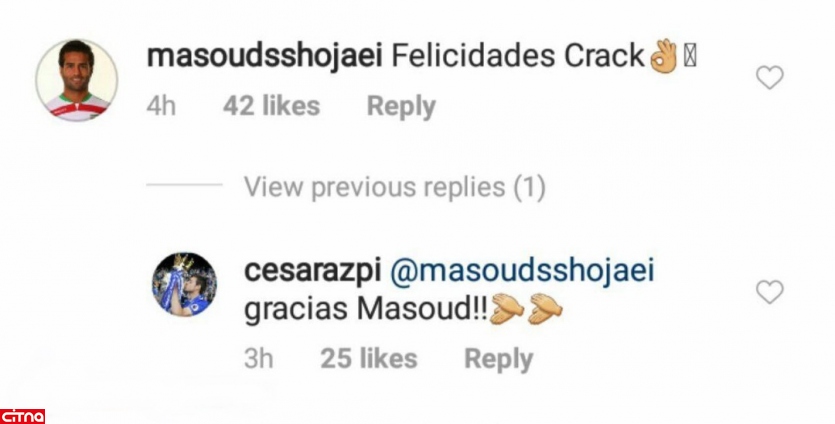 کاپیتان چلسی که در اینستاگرام خود از این اتفاق خبر داده بود با تبریک کاپیتان تیم ملی کشورمان که در باشگاه اوساسونا با او همبازی بود، روبرو شد. مسعود شجاعی به زبان اسپانیایی برای او نوشت: «تبریک میگم». سزار نیز در پاسخ نوشت: «ممنون، مسعود!»