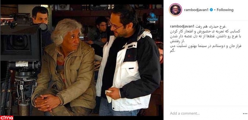 «فرج حیدری هم رفت. کسانی که تجربه حضورش و افتخار کار کردن با فرج رو داشتن، قطعا از ته دل غصهدار شدن از رفتنش. فراز جان و دوستانم در سینما بهتون تسلیت میگم.»