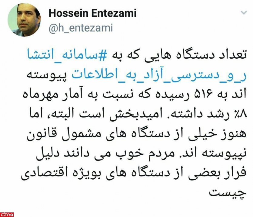 تعداد دستگاه هایی که به سامانه انتشار و دسترسی آزاد به اطلاعات پیوسته اند به ۵۱۶ رسیده که نسبت به آمار مهرماه ۸٪ رشد داشته. امیدبخش است البته، اما هنوز خیلی از دستگاه های مشمول قانون نپیوسته اند. مردم خوب می دانند دلیل فرار بعضی از دستگاه های بویژه اقتصادی چیست.