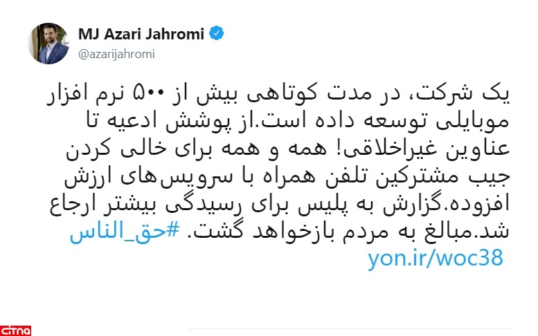 وزیر ارتباطات و فناوری اطلاعات، گفت: یک شرکت متخلف که ۵٠٠ نرم افزار موبایلی از ادعیه تا عناوین غیراخلاقی را برای خالی کردن جیب مردم وارد بازار کرده بود، به دام افتاد.