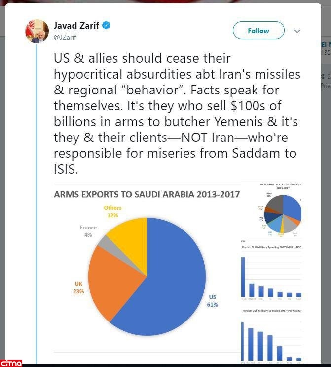 وزیر امور خارجه کشورمان با انتشار توئیتی درباره هزینه های نظامی کشورهای منطقه آمارهایی ارائه کرد.