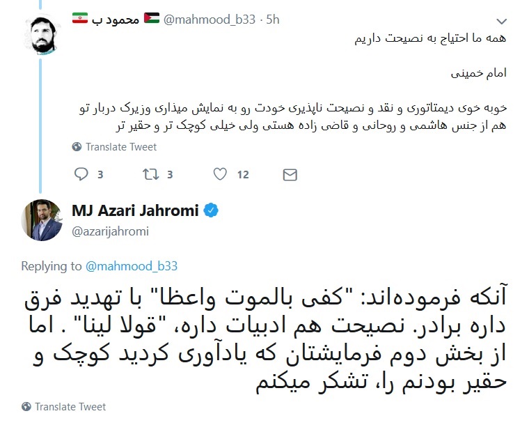 متانت وزیر جوان در پاسخ به تهدید اخیر یک کاربر توئیتر که وزیر را حقیر شمرد!