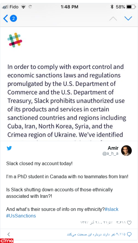 کاربر دیگری که دانشجوی دکترا در کاناداست نوشته بهخاطر ایرانی بودنش از دسترسی به این برنامه در کانادا محروم شده و هیچکدام از همکاران او ایرانی نیستند.